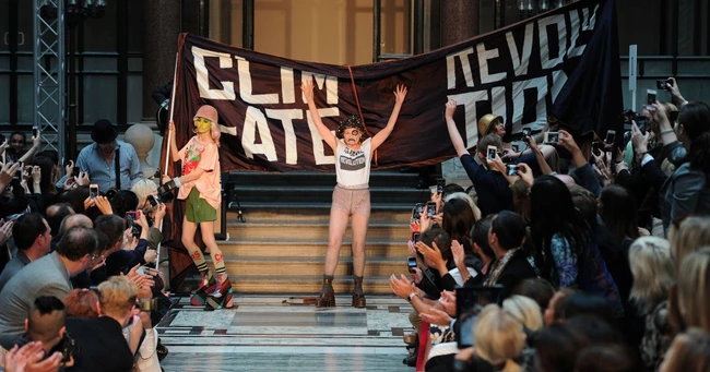 Show-ul care s-a desfăşurat la sediul central al Ministerului de Externe (Foreign & Commonwealth Office) a culminat cu apariţia lui Westwood ce a defilat într-un tricou alb inscripţionat „Climate Revolution“. Pe lângă vestimentaţie, doamna punk a purtat un machiaj în ton cu ideologia prezentării: cu mustaţă şi un ochi încercuit cu negru.