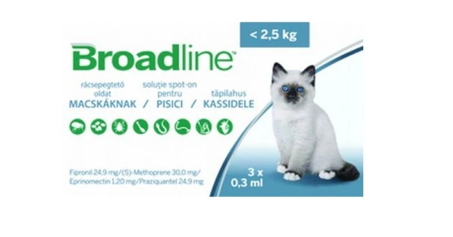 Broadline este un produs topic pentru tratamentul şi prevenţia infestaţiilor cu purici şi căpuşe, prevenţia dirofilariozei, tratamentul limbricilor, nematodelor şi a teniei, infestaţii la pisici adulte şi la pui de pisică mai mari de 7 săptamâni. Broadline are în combinaţie 4 ingrediente active (fipronil + (S)-metopren + eprinomectina + praziquantel ) şi protejează pisicile pentru o perioadă de 4 săptămâni.