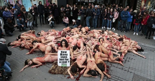 Activiştii din grupul Anima Naturalis s-au dezbrăcat complet, s-au acoperit cu sânge fals şi s-au întins pe jos în Plaza Catalunya din centrul Barcelonei, o zonă intens frecventată de turişti, scrie Daily Mail.