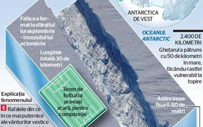 Specialiştii de la NASA au descoperit o fisură în Gheţarul Pine Island din vestul Antarcticii, care se lărgeşte şi se adânceşte încontinuu, până când va da naştere unui aisberg de mărimi colosale. Fisura, cu o lungime de 30 de kilometri, o lăţime de 80 de metri şi adâncă de 60 de metri, va provoca desprinderea unui aisberg de aproximativ 880 de kilometri pătraţi, suprafaţă similară cu cea a oraşului New York. Cum lăţimea crăpăturii se măreşte cu doi metri pe zi, oamenii de ştiinţă de la NASA au preconizat că uriaşul de gheaţă se va naşte până la sfârşitul anului.