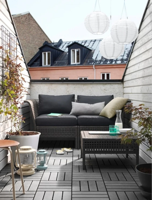 În afara colţului propriu-zis de lucru, balconul ar trebui să includă şi o zonă pentru destindere, pentru acele momente în care simţiţi nevoia să vă dezlipiţi de computer şi să vă relaxaţi puţin. Puteţi chiar să vă creaţi propria canapea folosind paleţi din lemn şi multe perne. În zilele ceva mai aglomerate, puteţi lucra şi de pe canapea cu ajutorul unui suport pentru laptop, precum BRADA. Şi dacă vreţi să ţineţi natura aproape, puteţi crea un mediu plăcut folosind câteva plante FEJKA, pe care nu e nevoie să le udaţi.