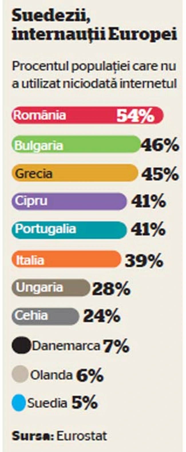 După ţara noastră, pe locul al doilea în rândul statelor UE codaşe la navigarea în mediul virtual se situează Bulgaria, urmată fiind de Grecia, Cipru sau Portugalia. La polul opus, în Suedia, Olanda şi Danemarca, procentajul celor care nu ştiu să folosească informaţiile din mediul online variază între 5 şi 7%. În ceea ce priveşte accesul la lumea virtuală, 47% din familiile din România au la dispoziţie o conexiune, în creştere semnificativă faţă de anul 2006, când procentul era de doar 14%. Când vine vorba de internetul de mare viteză - broadband -, mai puţin de o treime dintre gospodăriile din România (31%) beneficiază de aceste servicii, ceea ce ne plasează pe ultima poziţie, în condiţiile în care media europeană este de două ori mai mare (68%).