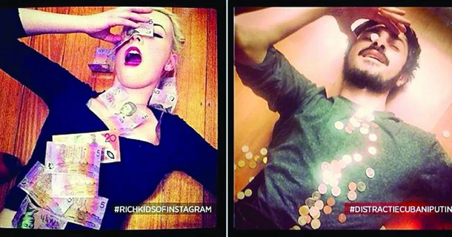 Fotografiile postate de români recreează pozele postate de copiii bogaţi ai Instagramului, cu deosebirea că, de exemplu, în locul unei tinere acoperite cu lire sterline, varianta mioritică înfăţişează un băiat tapetat cu mărunţiş strălucitor. La fel, un tânăr care s-a pozat ţanţoş cu un elicopter roşu este ironizat de un altul care se mulţumeşte şi cu un aparat de zbor de jucărie aterizat în echilibru precar pe un umăr.