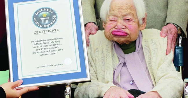Născută la 5 martie 1898, sub povara celor 116 ani, Misao Okawa (foto jos), din Japonia, deţine recordul mondial pentru longevitate şi pare că va prinde şi aniversarea cu numărul 117. Doamna Okawa a dezvăluit că are grijă ca cel puţin o dată pe lună să mănânce sushi, în rest secretul ei se rezumă la relaxare, mese regulate şi cumpătate şi respectarea programului de somn.