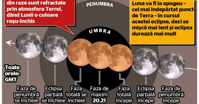 Cea mai lungă eclipsă totală de lună a secolului 21 va fi vizibilă din România în seara de vineri INFOGRAFIE