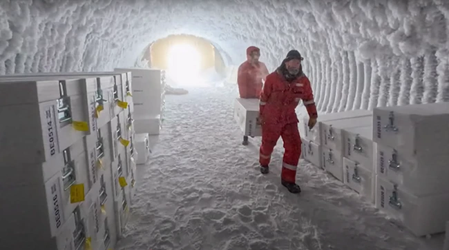 Miezurile de gheață au fost depozitate într-o peșteră din Antarctica înainte de a fi încărcate pe o barcă spre Europa.