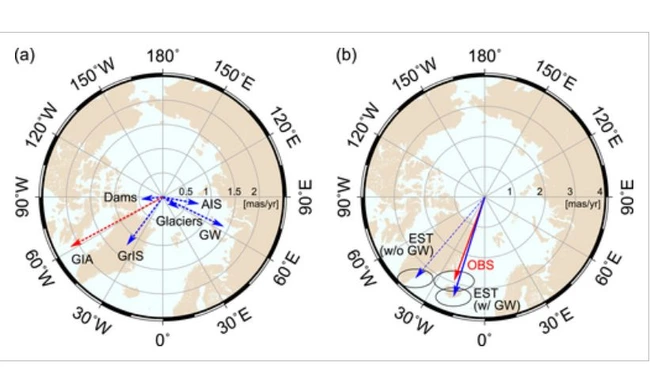 Un studiu recent a arătat că estimarea modelului de redistribuire a apei către oceane ar duce la o deplasare a polului de rotație al Pământului, cu aproximativ 78,48 cm spre Est (64,16 grade).