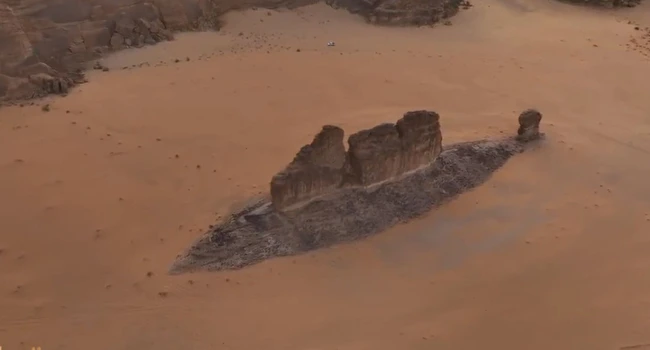 În imaginile filmate cu drona înregistrate de Al Enazi în luna iunie a acestui an, formațiunea stâncoasă seamănă cu o creatură acvatică care înoată prin nisipul auriu, structurile sale asemănătoare aripioarelor dorsale sugerând, de asemenea, că ar putea fi un rechin care iese din adâncuri pentru a-și urmări prada.