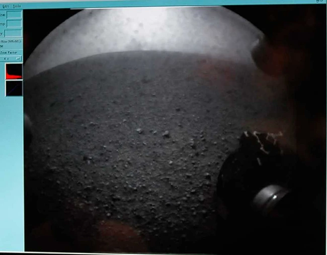 UPDATE Robotul Curiosity a trimis o nouă poză către NASA. Acum, aceasta este mai clară, datorită faptului că a fost înlăturat capacul care proteja obiectivul de praf.