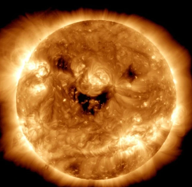 „Astăzi, Observatorul de dinamică solară de la NASA a surprins soarele „zâmbind.” Văzute în lumina ultravioletă, aceste pete întunecate de pe Soare sunt cunoscute sub denumirea de găuri coronare și sunt regiuni în care vântul solar rapid țâșnește în spațiu”, se arată în descrierea postării.