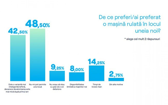 Conform studiului derulat de Spotawheel, aproape 50% dintre români au declarat că au decis să cumpere o maşină second hand, deoarece nu îşi permit un vehicul din showroom. În plus, 42% dintre respondenţi consideră că achiziţia unui vehicul rulat este o bună investiţie, fiindcă pierderea de valoare a maşinii este mai mică după un an.