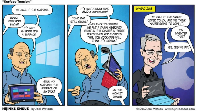 S-a dovedit că unii comedianţi pot fi adevăraţi profeţi uneori. Hijinks Ensue şi Joel Watson au creat o bandă desenată în 2012 în care au prezis că iPad-ul va primi o tastatură similară cu cea de la Microsoft, şi, chiar mai interesant, că se va întâmpla în anul 2015.