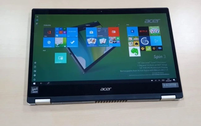 0Acer Spin 3 e un laptop subţire din clasa medie, cu ecran tactil şi funcţii de tabletă grafică, echipat cu procesor Intel Core de generaţia a 10-a şi cu sistem de operare Windows 10 Home.