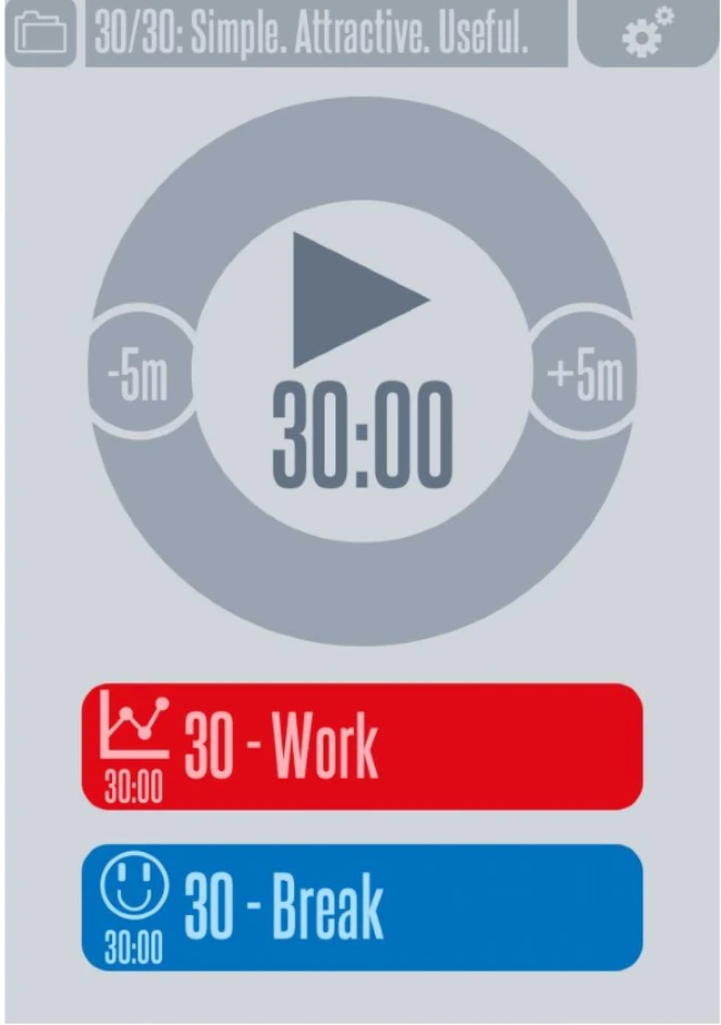 Unul dintre punctele forte ale acestei aplicaţii este designul şi modul cum funcţionează. Este un program care se bazează în mare parte pe gesturile pe care le putem face cu degetele pe ecran. Pentru a crea un task nou trebuie să tragem cu degetele de ecran, ca într-un zoom out şi apare o listă de diferite tipuri de activităţi pe care le putem îndeplini. Evident, după cum îi spune şi numele, durata clasică este de 30 de minute, iar ea poate fi crescută în funcţie de tipul de activitate.