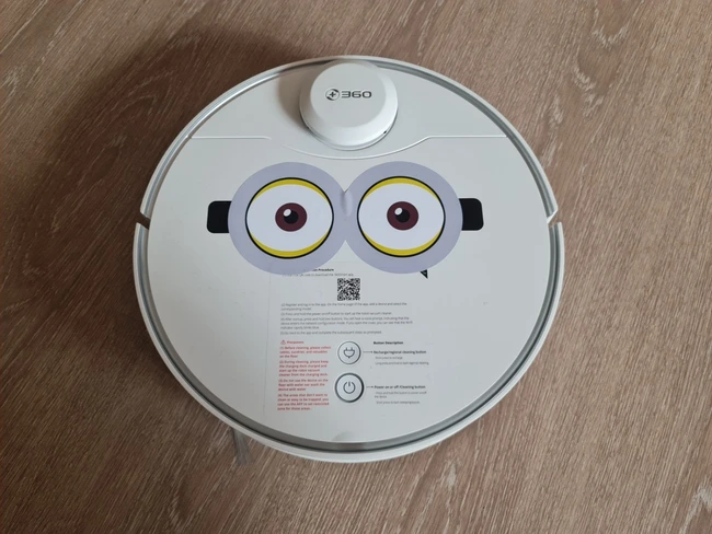 Aspiratorul în sine este circular, ca toate din această piaţă, şi în cutie este inclus şi un sticker cu ochi pe care îi poţi lipi pe suprafaţa sa, dacă doreşti (bineînţeles că am făcut-o). Este un robot destul de mare, alb, cu un diametru de 35 de centimetri şi o înălţime de 9 centimetri, iar logo-ul 360 este plasat deasupra capacului care ascunde compartimentele în care se strâng murdăria şi apa.