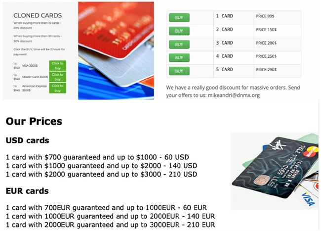 Carduri de credit – clonate, furate sau falsificate, cardurile de credit se vând la un preț mult sub valoarea reală pe care infractorii o „garantează”, de regulă între 7 și 14%. De exemplu, un card care are în cont 1.000-2.000 de dolari poate fi achiziționat pentru 140 de dolari, iar un card Visa Gold cu număr CVV, care are un sold de 25.000 de dolari, se vinde cu 175 de dolari.