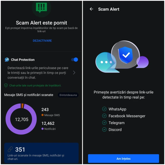 - alerteză în cazul riscurile financiare și de pierdere de date -- Atunci când utilizatorii primesc un link suspect în aplicațiile de mesagerie, notificări sau mesaje text, aceștia sunt informați pentru a preveni accesarea sau distribuirea mai departe a linkului.