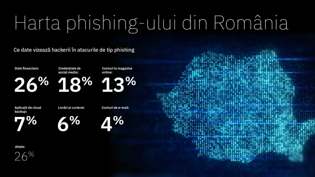 Astfel, 26% dintre tentativele de phishing monitorizate au avut ca scop obținerea datelor bancare sau accesul la conturile utilizatorilor. În topul datelor râvnite de atacatori, urmează accesul la conturi de social media (18%), de magazine online (13%), de distribuție de fișiere (7%), companii de livrări și curierat (6%) și servicii de e-mail (4%).