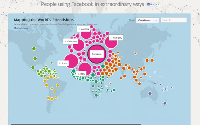 0O absolventă a Universităţii Stanford, Mia Newman, a realizat o scanare a relaţiilor dintre utilizatorii de Facebook bazată pe conexiunile dintre utilizatorii din diverse ţări. Ea a realizat o artă interactivă care spune extrem de multe despre ce ţări contează unele pentru altele.
