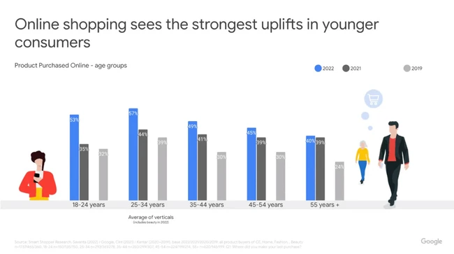 Shopping-ul online a crescut cel mai mult în categoria celor tineri în 2022: peste jumătate dintre persoanele cu vârste între 18 și 34 de ani au spus că cea mai recentă achiziție a fost online, față de în jur de 40% în urmă cu un an. În ceea ce privește dispozitivul, datele Google arată că jumătate dintre românii care cumpără online fac achiziția de pe smartphone.