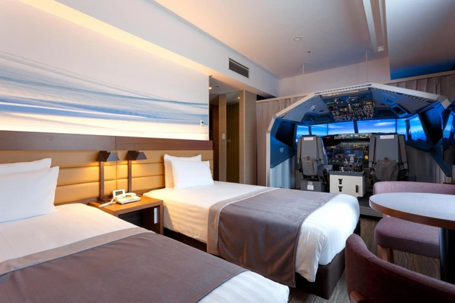 0Un hotel din Japonia oferă o experienţă inedită, special realizată pentru pasionaţii de aeronautică, care îşi pot exersa abilităţile de pilot într-un simulator de zbor, amplasat într-unul din pereţii camerei.