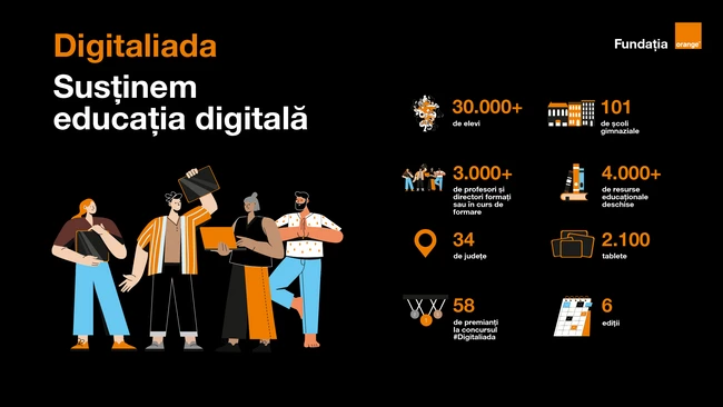 0Digitaliada, programul de educație digitală gratuit, susținut de Fundația Orange, a ajuns la cea de-a 7-a ediție. Cu fiecare nouă ediție platforma educațională Digitaliada se extinde, oferind materiale noi, conținut digital autentic și interactiv, pentru elevii de școală primară și gimnaziu.