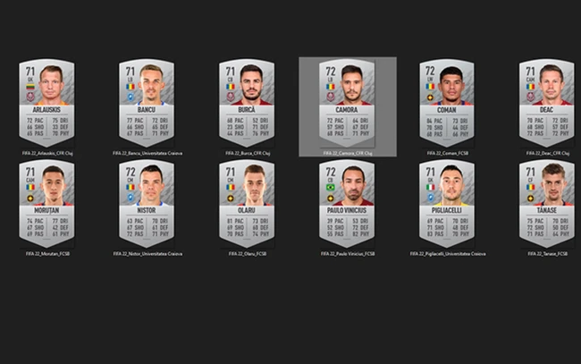 Camora, Dan Nistor, Florinel Coman, Paulo Vinicius, Denis Alibec şi Ciprian Deac se regăsesc din nou printre fotbaliştii cu cei mai mari coeficienţi din Liga I în FIFA 22, aceştia clasându-se şi în FIFA 21 în Top 10 cei mai bine cotaţi fotbalişti din Liga I din România.