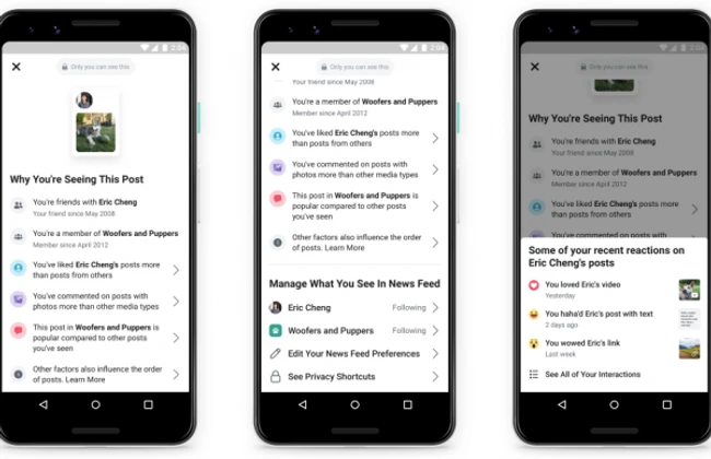 Funcţia va putea fi accesată în colţul din dreapta sus al postărilor realizate de prieteni, pagini sau diferite grupuri care îţi apar în news feed şi va include date despre cum decide algoritmul Facebook să ”claseze” aceste postări, precum: