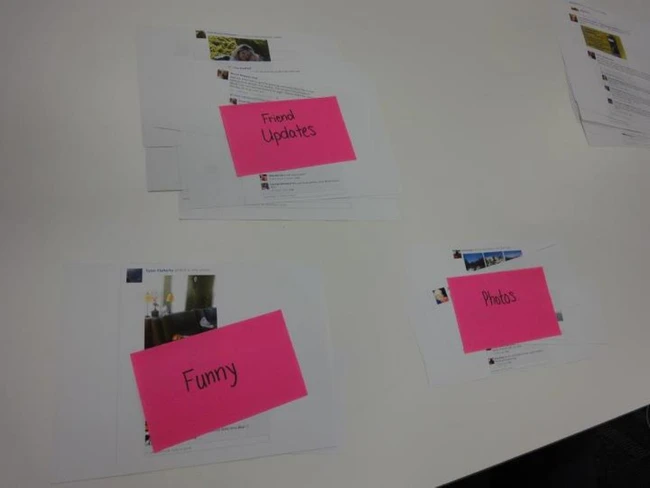 Din toată această cercetare, mai mult sau mai puţin ştiinţifică, a reieşit că cel mai bine e ca Facebook să furnizeze diverse fluxuri - pentru muzică, pentru prieteni etc. Pentru a vedea care feed e mai important pentru utilizatori, echipa a apelat la, se poate spune, amestecarea unui pachet de cărţi. Numai că, în cazul acesta, cărţile au fost foi tipărite cu informaţii şi poze.