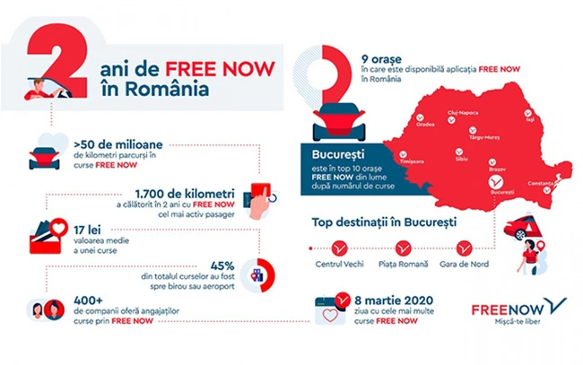 Cu ocazia împlinirii celor 2 ani de prezenţă în România, pe data de 27 noiembrie, ca semn de apreciere din partea FREE NOW, şoferii vor beneficia de 0% comision, iar pasagerii care aleg să călătorească cu FREE NOW, vor avea parte de reduceri semnificative la plata prin aplicaţie.