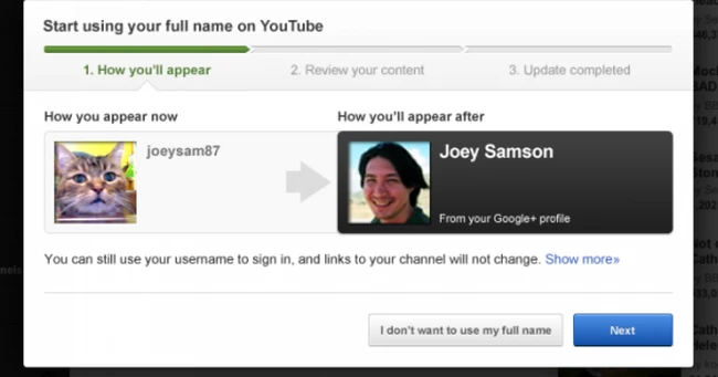 Google+ este reţeaua socială a Google şi cere încă de la început numele real celor care doresc să se înregistreze. Prin conectarea la YouTube cu contul de G+ se trece şi la folosirea numelui real. Totuşi, utilizatorii care nu vor să-şi piardă reputaţia obţinută cu un pseudonim şi-l pot păstra pe acesta.