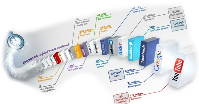 Că tot ziceam de date, sunt încărcate 3.000 de fotografii pe Flickr şi 1,3 milioane de videoclipuri pe YouTube. Şi Pandora, un serviciu de streaming livrează 61.141 de ore de muzică. Dacă se trage linie, se ajunge la 640.000GB de date per minut schimbate prin cablurile de Internet.