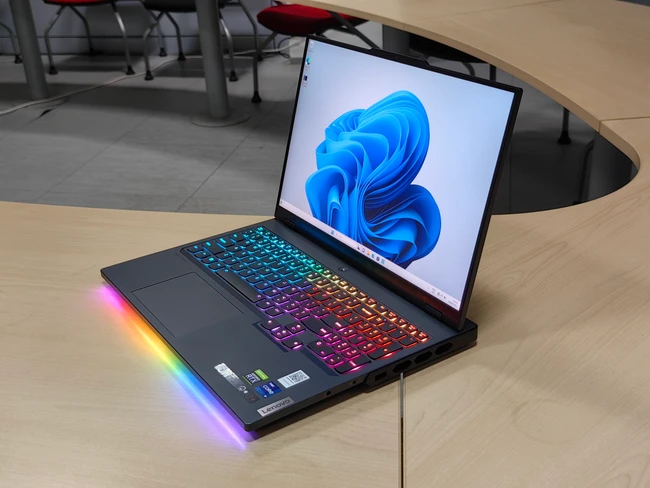 Legion 7 Pro poate fi imediat recunoscut ca un laptop de gaming datorită tastaturii iluminate RGB și a benzii LED de pe partea frontală.