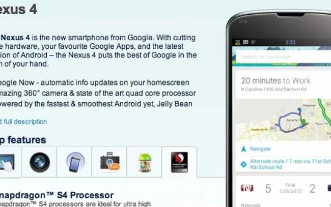 Magazinul Carphone Warehouse din Marea Britanie a publicat o pagină de precomandă care confirmă datele preliminare ale smartphone-ului şi fixează ca dată de livrare 30 octombrie, notează „The Verge“. Primele informaţii despre acest model au venit de la un site din Belarus, fiind apoi confirmat de LG. La nivel tehnic, Nexus 4 este bazat pe smartphone-ul Optimus G.