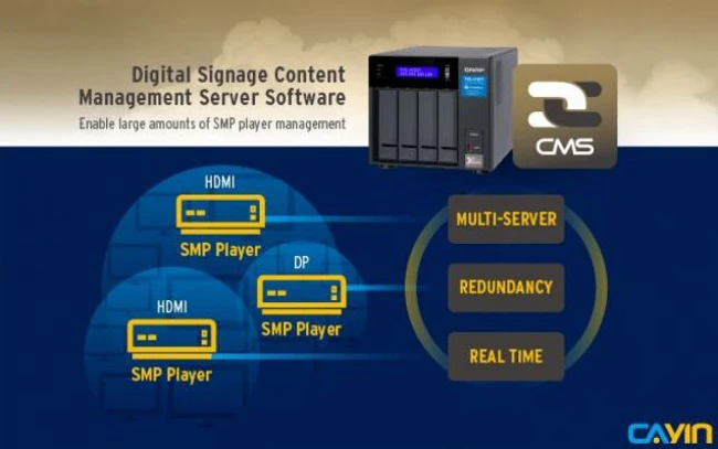 Aplicaţia integrează serverul de administrare a conţinutului (CMS) CAYIN Digital Signage într-un NAS QNAP, permiţându-le utilizatorilor să administreze simultan până la 4.000 de playere CAYIN SMP şi grupuri de playere pentru sincronizarea listelor de redare şi a conţinutului. Totodată, oferă opţiuni de programare flexibilă incluzând redarea o singură dată, zilnică, săptămânală, lunară sau anuală. Utilizatorii pot instala CAYIN CMS Station pe serverul QNAP NAS, descărcând-o din magazinul QTS App Center.