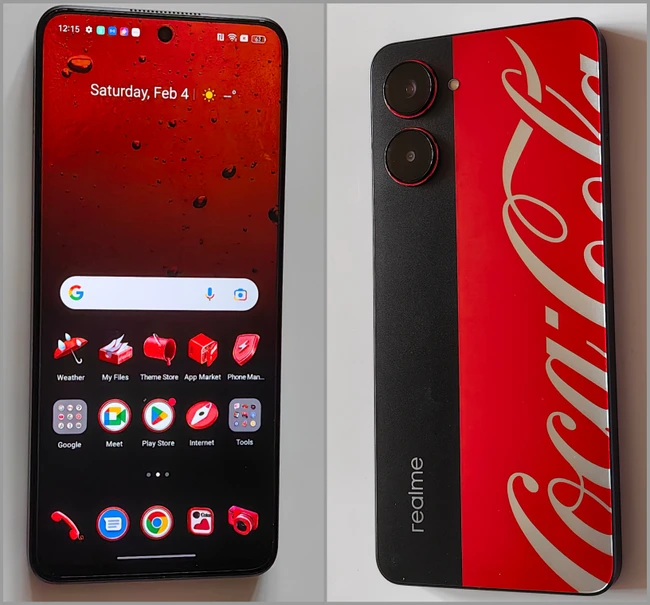 Smartphone-ul e din start un spectacol, cutia este plină de trimiteri către Coca Cola, până și felina inclusă, mascota REALMEOW, este în culoarea unei sticle de băutură răcoritoare, dar conținutul său nu poate fi consumat.