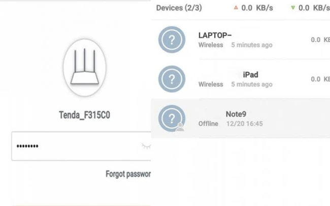 Pentru conectare şi setări am folosit tot aplicaţia TendaWifi, vezi în stânga logarea, în dreapta dispozitivele de test.