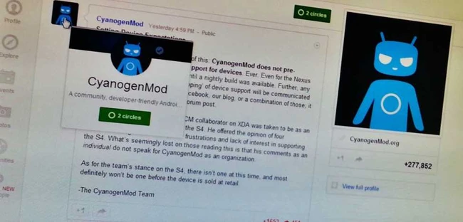 Echipa mare, CyanogenMod, a spus că nu s-ar grăbi să spună „nu“ telefonului de la Samsung şi consideră că vor putea veni cu un răspuns concret atunci când Galaxy S4 va fi disponibil la vânzare. „CyanogenMod nu pre-anunţă suportul sau lipsa acestuia pentru noile dispozitive. Niciodată. Nici măcar pentru Nexus 4 nu am anunţat suportul decât când am avut un nightly build“, au comunicat aceştia pe Google+.