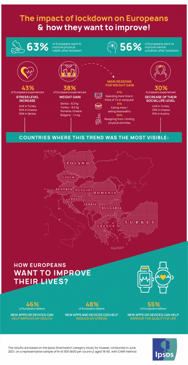Potrivit studiului IPSOS realizat pentru Huawei, ultimele luni au avut un impact mare asupra nivelului de stres al popoarelor din Europa. Marea majoritate a respondenţilor declară că a devenit mai greu să separe viaţa privată de cea profesională şi să menţină un echilibru sănătos între acestea. În consecinţă, studiul evidenţiază că nivelul stresului s-a agravat în medie pentru 43% dintre oameni, iar naţiunile care au suferit cel mai mult au fost turcii (54%), grecii (52%) şi sârbii (50%).