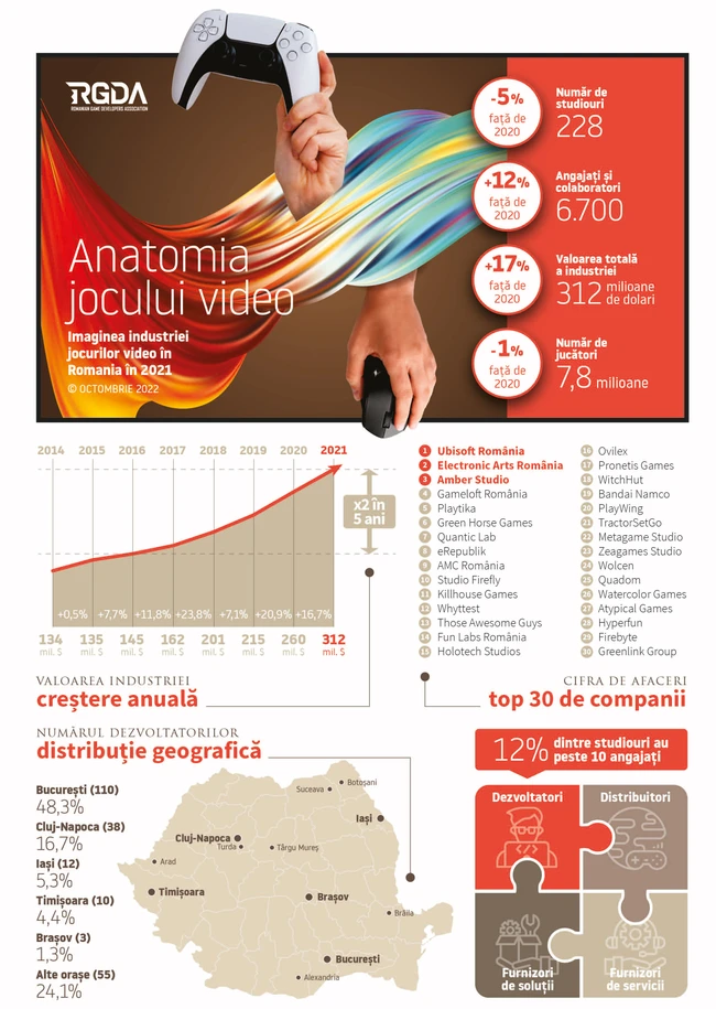 Cifra reprezintă o creștere de 20% față de 2020 și este de peste 2 ori mai mare decât cea din 2016. Datele sunt oferite de studiul anual realizat de RGDA (Asociația Dezvoltatorilor de Jocuri Video din România). În plus, în studiourile românești lucrează în prezent 6700 de specialiști, cea mai mare creștere de la an la an a numărului de angajați din industria creativă, de 13% față de 2020.