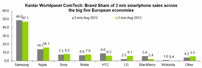 Pieţele analizate de Kantar sunt Marea Britanie, Franţa, Germania, Italia şi Spania. Cum stau producătorii aici? După cum se poate vedea în graficul de mai jos, Samsung domină cu 47,1%, dar e în scădere. Trebuie să luăm aminte că nu e trimestrul în care a venit Samsung Galaxy Note 3. Apple are 16,1%, dar nu au apărut pe piaţa cele două noi modele, în timp ce Sony are 8,2%, iar Nokia 7,8%. HTC a ajuns la 6,3%, în timp ce BlackBerry s-a prăbuşit la 2,4%.