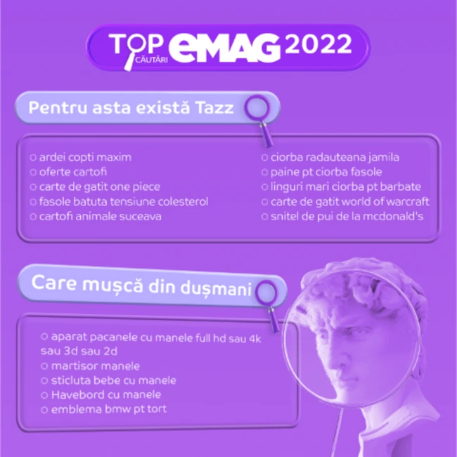 În plus față de articole necesare pentru ei și familie, românii au căutat pe eMAG și răspunsuri la întrebări existențiale precum „de ce e greu să iubești” ori „cum te poți proteja de energiile negative” sau „ce să nu faci la liceu”.