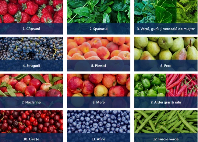 46 de fructe și legume au fost analizate de EWG. Dintre acestea, 12 au fost identificate ca fiind cele mai contaminate cu pesticide și sunt considerate riscante pentru sănătate din cauza nivelului ridicat de reziduuri chimice.