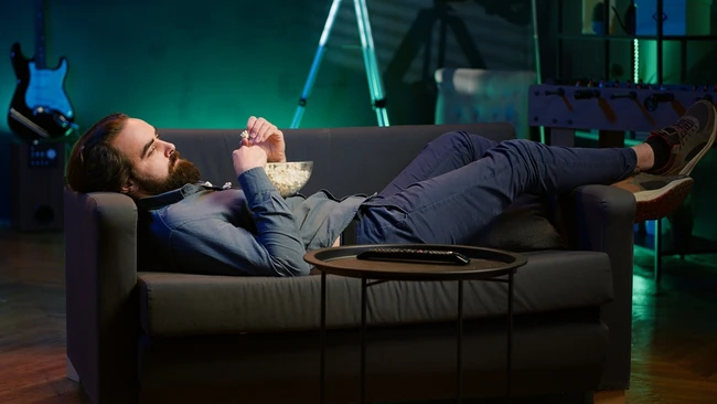 În timp, un stil de viață sedentar devine periculos, așa cum o ilustrează imaginea lui Sam, o reprezentare a omului sedentar mediu din viitor: ochi înfundați în orbite, picioare umflate și așa-numitul gât tehnologic, specific celor care stau aplecați vreme îndelungată asupra ecranelor.