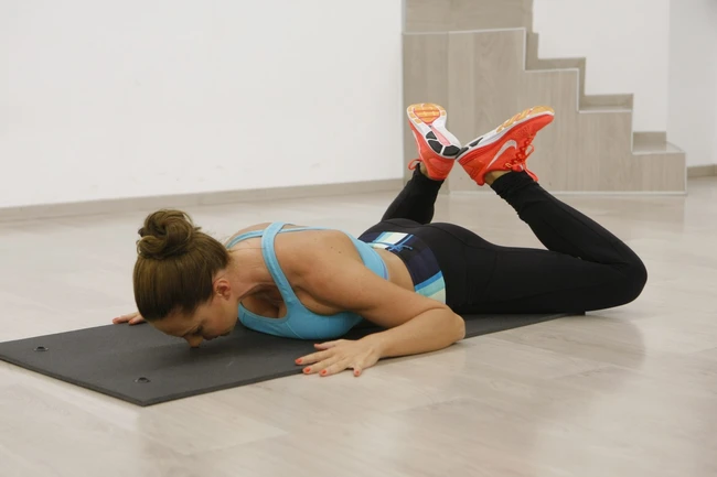 Ne aşezăm pe coate şi genunchi, menţinând coloana întinsă şi abdomenul încordat. Ţinem piciorul de lucru întins în spate, cu talpa flexată şi coapsa încordată. Inspirăm şi ridicăm piciorul în linie cu coloana vertebrală, fără a relaxa abdomenul. Expirăm şi flexăm genunchiul până la 90 de grade, ţinându-l câteva secunde fix. Mişcarea se execută lent şi controlat. Exerciţiul creşte mobilitatea şi activează muşchii fesieri şi zona posterioară a coapsei, îmbunătăţind drenajul limfatic. Se fac patru seturi a câte opt repetări, pentru fiecare picior.