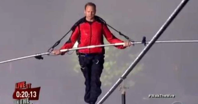 0Nik Wallenda, considerat "regele" mersului pe sârmă, a mers 550 de metri pe deasupra cascadei Niagara, traversând-o de la un capăt la altull.