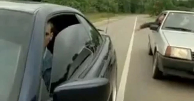 Scena face parte dintr-un film rusesc cu mafioţi, dar metoda prin care îi poţi face pe şoferi să nu te mai depăşească este cât se poate de eficientă.