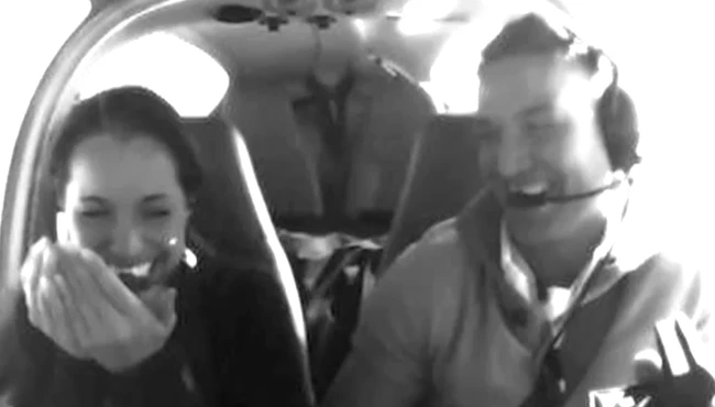 Avionul îşi revine în poziţia normală de zbor, iar el o întreabă: "Vrei să te căsătoreşti cu mine?". În acel moment ea strigă: "DA!".