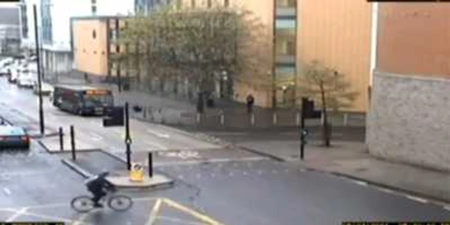 Imaginile surprinse de camerele de supraveghere din zonă arată cum autobuzul încearcă să-l depăşească pe biciclist, dar acesta avea o viteză care i-a permis să reziste în faţa vehiculului. Nervos, şoferul de autobuz a virat brusc stânga şi l-a împins pe biciclist jos.