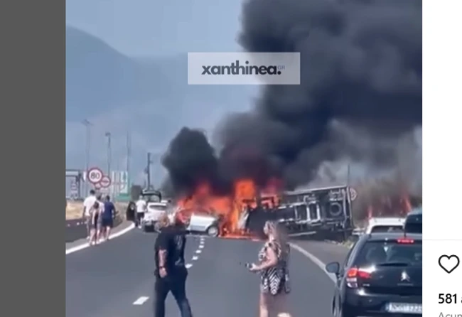 Video Accident groaznic în drum spre Thassos: trei oameni au murit carbonizați, după ce un TIR a intrat în două mașini